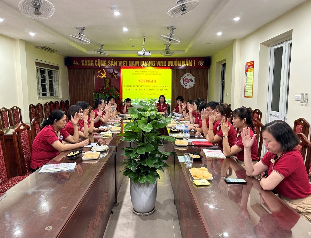 Thực hiện kế hoạch số 105-KH/ĐU ngày 11/09/2023 của Đảng uỷ phường Việt Hưng về tổ chức đợt sinh hoạt chính trị, tư tưởng thực hiện chỉ thị số 24-CT/TU của Ban thường vị Thành uỷ Hà Nội, chiều ngày 22/09/2023, Chi bộ Trường Tiểu học Việt Hưng thực hiện buổi sinh hoạt tư tưởng, chính trị theo kế hoạch. 100% Đảng viên đã tham gia đúng giờ trên tinh thần nghiêm túc, hiệu quả.