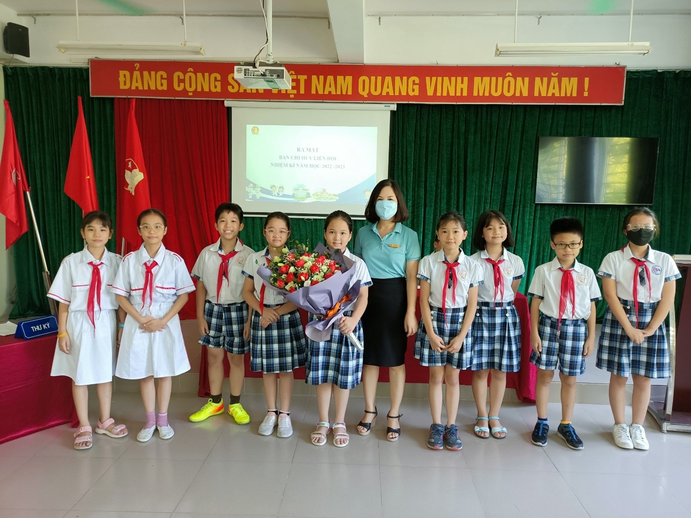 Dự Đại hội, Cô Nguyễn Thị Thức – BT Chi Bộ - Hiệu trưởng nhà trường đã tặng hoa chúc mừng và giao nhiệm vụ cho Ban Chỉ huy Liên đội mới. Cô mong các bạn sẽ đoàn kết, phát huy tinh thần tự quản hoàn thành xuất sắc nhiệm vụ năm học, giữ vững được danh hiệu Liên đội mạnh cấp Thành phố.
