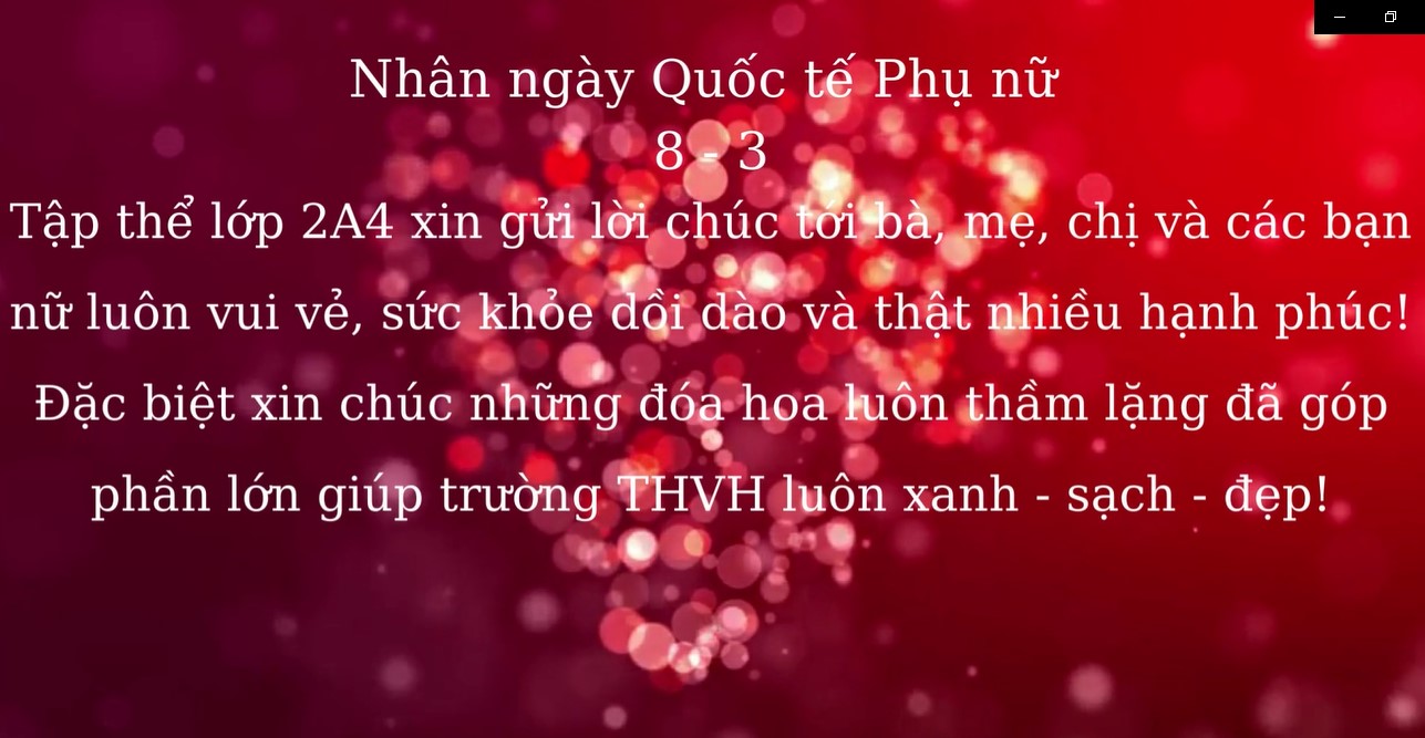 Nhân ngày Quốc tế Phụ nữ 8 – 3, tập thể lớp 2A4 xin gửi lời chúc tới những đóa hoa thầm lặng lời chúc tốt đẹp nhất. Chúc các cô, các bác luôn luôn vui vẻ, sức khỏe dồi dào và thật nhiều niềm vui, hạnh phúc trong công việc cũng như trong cuộc sống.