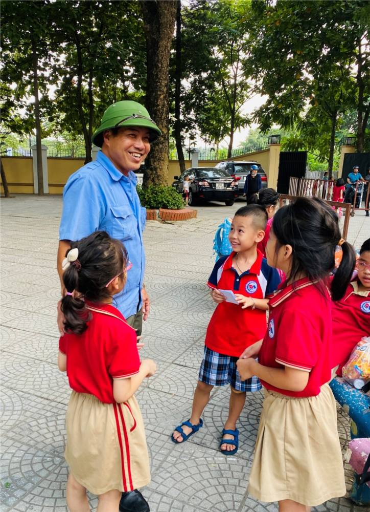 em học sinh vây quanh bác bảo vệ cười nói vui vẻ sau giờ học.
