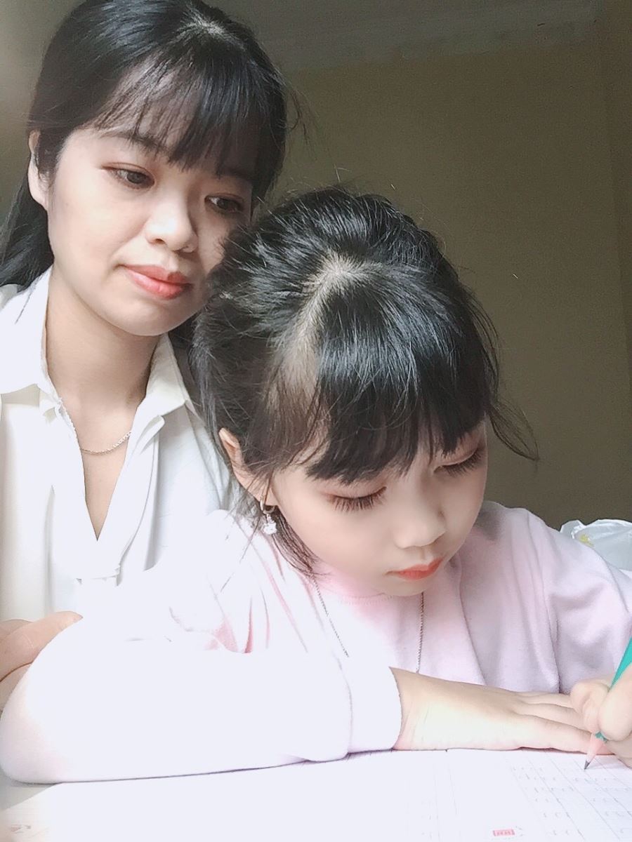 Mẹ và Khánh Ngọc say sưa luyện viết sau mỗi giờ học.