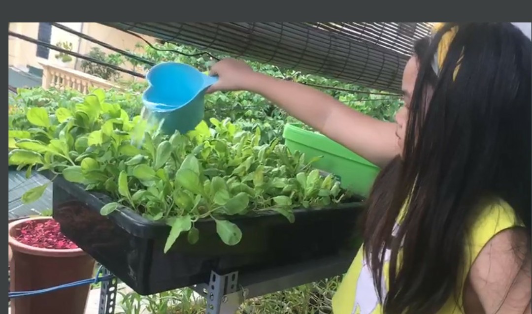 Hình ảnh Linh Hương giúp mẹ tưới cây.