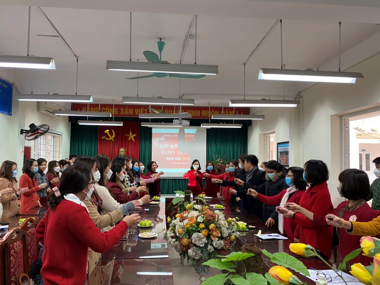 Đồng chí Nguyễn Thị Thức- Bí thư CB, Hiệu trường chúc Tết mọi người Những tràng pháo tay giòn giã của mọi người như cảm ơn lời chúc cũng như nhất trí, đồng lòng cùng nhau cố gắng đạt nhiều thắng lợi thành công trong năm 2022 của tập thể giáo viên nhân viên trong trường.