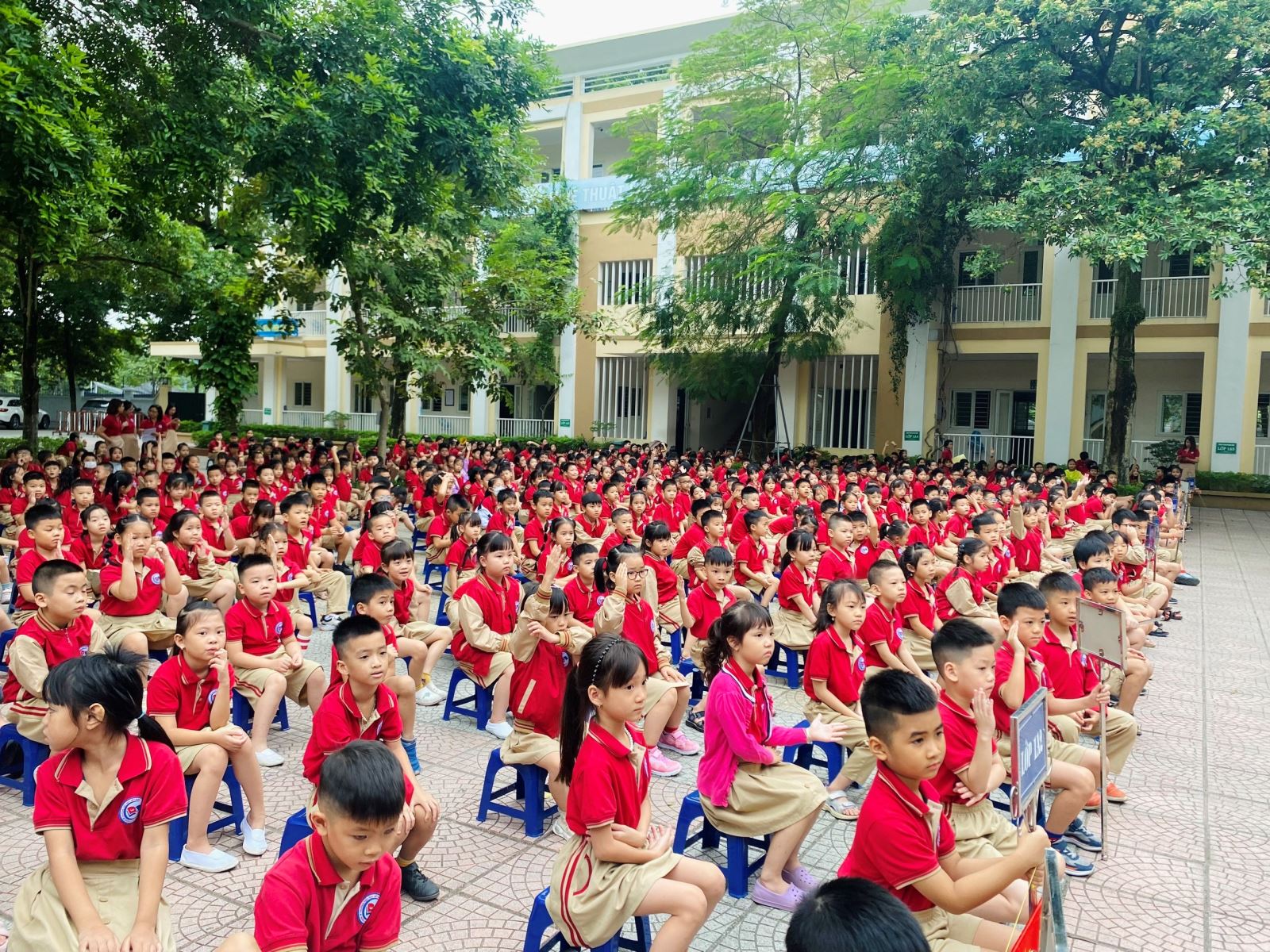 Phần nghi lễ chào cờ, hát Quốc ca, Đội ca diễn ra trong không khí trang trọng, cả trường đứng nghiêm, cùng hướng nhìn về lá cờ Tổ quốc đang tung bay trong gió. Sau phần nghi lễ là phần tổng kết thi đua tuần 7, các tập thể lớp dẫn đầu về nề nếp đã vinh dự được nhận cờ thi đua từ cô Nguyễn Thị Thức – Bí thư chi bộ, Hiệu trưởng nhà trường trao tặng cho với nhiều lời ngợi khen. Sau một tuần với sự cố gắng của cả tập thể lớp, nhận trên tay cờ thi đua, các em chắc hẳn vô cùng tự hào.