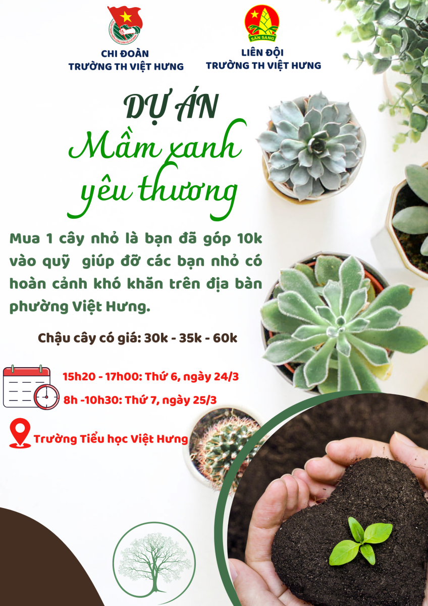 Dự án “Mầm xanh yêu thương” là một trong những hoạt động chào mừng ngày thành lập Đoàn TNCS Hồ Chí Minh vô cùng thiết thực và đầy tính nhân văn của Chi Đoàn nhà trường. Hy vọng rằng hoạt động này được nhân rộng và lan tỏa mạnh mẽ hơn nữa để hạt mầm yêu thương, đoàn kết sẽ nhân rộng trong tập thể Trường Tiểu học Việt Hưng nói riêng và cộng đồng nói chung.