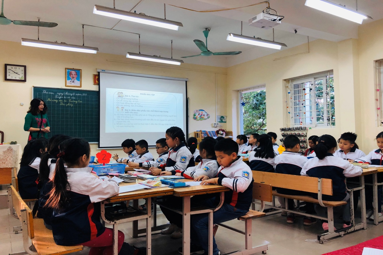 Sau thời gian 2 phút thảo luận, các nhóm chuyên gia đã hoàn thành nhiệm vụ và di chuyển quay trở lại nhóm trụ sở để trao đổi với các bạn trong nhóm những nội dung mà nhóm chuyên gia đã tìm hiểu được. Sôi nổi nhất là phần trình bày của các nhóm, các con trình bày rõ ràng, mạch lạc đồng thời còn giao lưu với các bạn rất sôi nổi… Sau phần tìm hiểu, cô giáo đã cung cấp thêm các từ ngữ về trường học và giúp các con hiểu thái độ, tình cảm của mọi người trong trường học, mối quan hệ giữa các nhóm từ. Không những thế, cô Âu Thị Chinh còn giúp các con vận dụng ngay những từ ngữ vừa tìm được để đặt câu, viết đoạn văn về chủ điểm trường học. Ở bài tập 2, cô giáo đã giúp các con hiểu thêm về cách sử dụng dấu phẩy và giáo duch học sinh thêm yêu trường, lớp thông qua clip về trường tiểu học Việt Hưng.