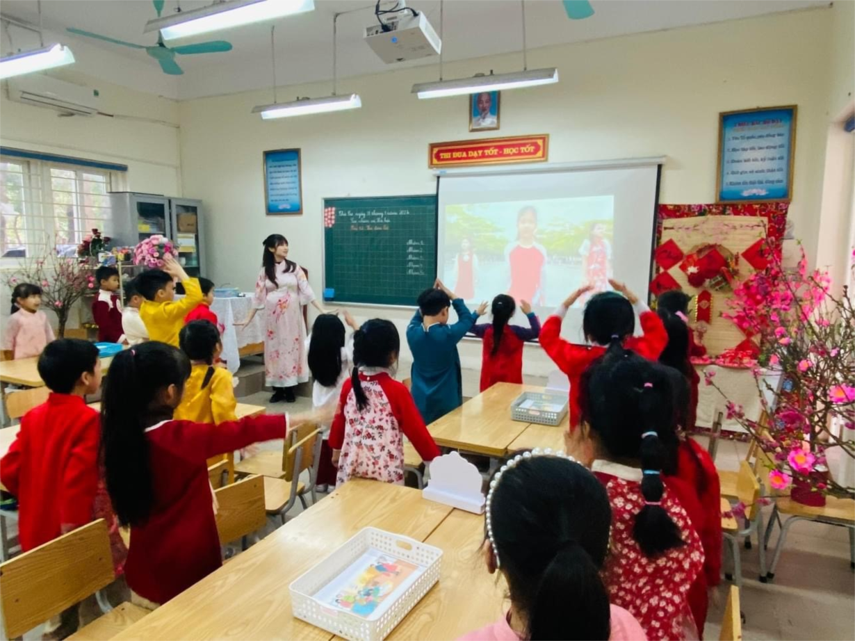 Bên ngoài thời tiết khá lạnh nhưng bên trong phòng học lớp 1A3, không khí thật ấm cúng, sôi nổi bởi dưới sự hướng dẫn khéo léo của cô Hà, các con học sinh học tập thật hăng say, hứng khởi. Các em tích cực, chủ động tham gia vào các hoạt động trải nghiệm trong bài học với tất cả sự háo hức mong chờ Tết đến. Các con được tìm hiểu về ngày Tết, các hoạt động chuẩn bị đón Tết, các món bánh kẹo cổ truyền, đặc sản của nhiều vùng miền Tổ quốc,… qua các hoạt động dạy học sáng tạo của cô Hà. Điều bất ngờ nhất trong tiết học, học trò được tự tay bưng đĩa bánh chè lam thơm ngon đặc biệt- món quà quê hương mời các thầy cô giáo dự giờ. Cuối tiết học, các em được cùng nhau tô màu những chiếc thẻ treo xinh xinh rồi trang trí cành đào rực rỡ đón Tết. Sau ít phút, phòng học lA3 đã trở thành một căn phòng rực rỡ sắc xuân. Tiết học Tự nhiên xã hội của lớp 1A3 là một tiết học hạnh phúc, thật sự thành công.