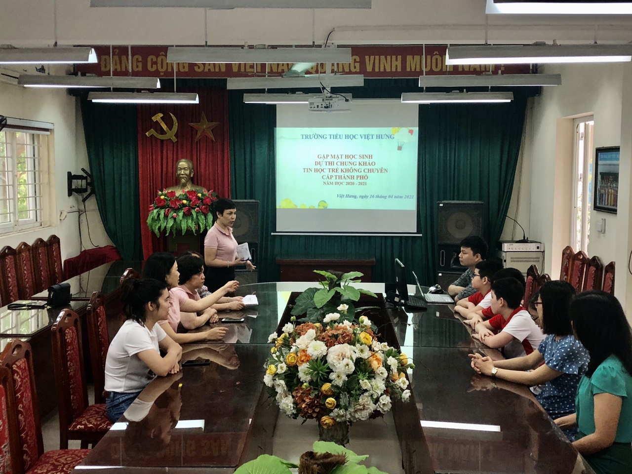 Sáng nay 16/04/2021, trường Tiểu học Việt Hưng tổ chức gặp mặt, tặng quà, động viên 5 bạn học sinh được chọn vào đội tuyển của quận Long Biên tham dự vòng thi chung khảo tin học trẻ không chuyên cấp Thành phố, năm học 2020-2021. Đến dự buổi gặp mặt có đầy đủ BGH, Cấp Ủy và Ban chấp hành công đoàn nhà trường.