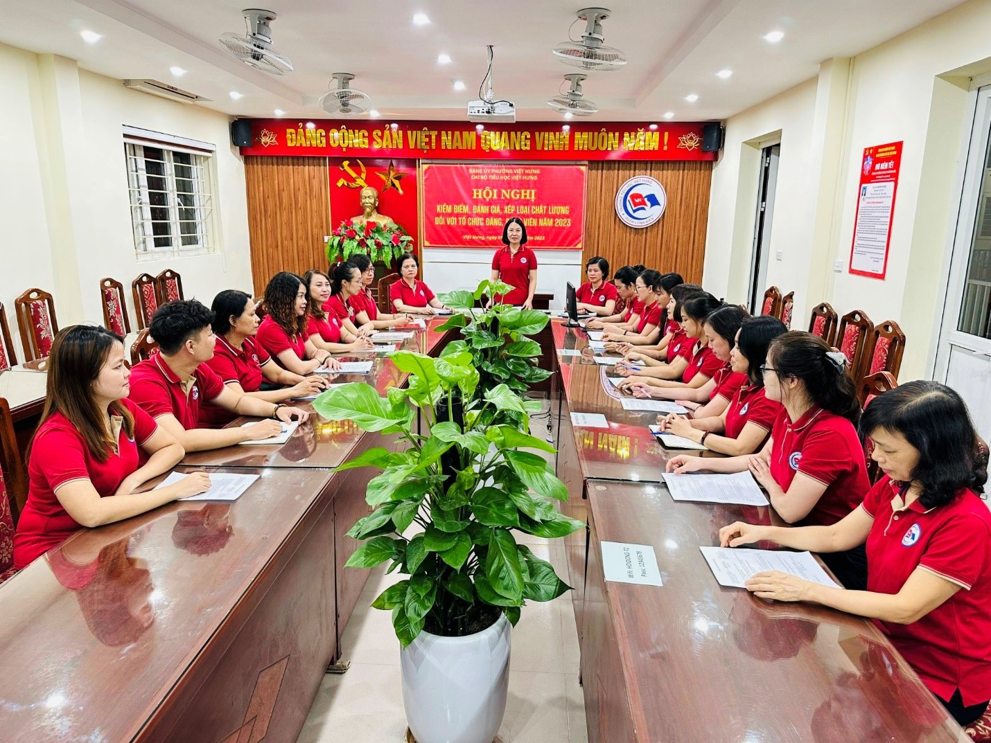 Thực hiện kế hoạch số 109-KH/ĐU, ngày 22 tháng 11 năm 2023 của Đảng ủy phường Việt Hưng về kiểm điểm, đánh giá, xếp loại chất lượng hằng năm đối với tổ chức đảng, đảng viên và tập thể, cá nhân cán bộ lãnh đạo, quản lý, chiều ngày 1 tháng 12 năm 2023, Chi bộ Trường Tiểu học Việt Hưng tổ chức Hội nghị kiểm điểm, đánh giá, xếp loại chất lượng đối với tổ chức đảng, đảng viên năm 2023.