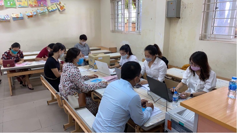 Đúng 7 giờ 30 phút, Hội đồng tuyển sinh của trường Tiểu học Việt Hưng đã có mặt sẵn sàng tiếp đón các bậc phụ huynh đến đăng kí trực tuyến và nộp hồ sơ cho con. Trước khi vào phòng tuyển sinh, phụ huynh được hướng dẫn sát khuẩn tay và đo thân nhiệt. Phòng tuyển sinh đông người nhưng luôn đảm bảo trật tự, phụ huynh ngồi giãn cách theo quy định.