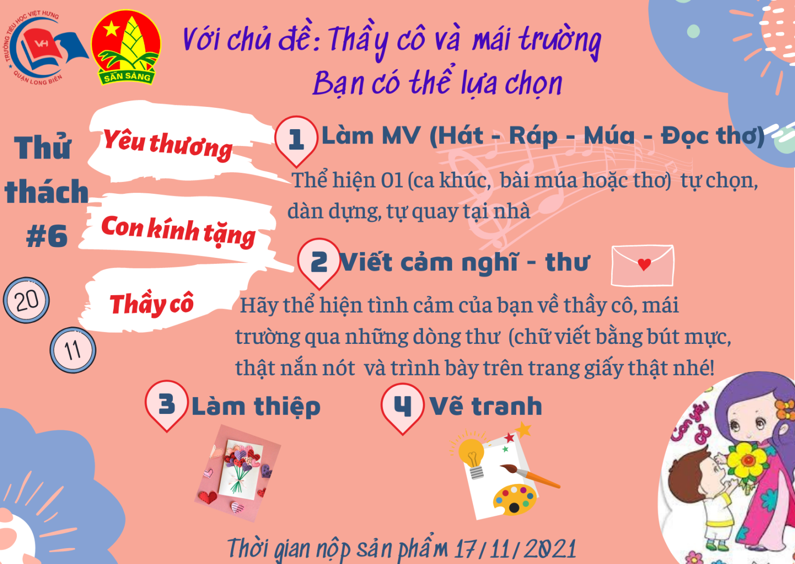 Chảo mừng 39 năm ngày Nhà giáo Việt Nam 20/11, Liên đội trường Tiểu học Việt Hưng triển khai thử thách #6_ Yêu thương con kính tặng thầy cô. Học sinh có thể làm MV hát, múa, đọc thơ hoặc viết thư, làm thiệp hay vẽ tranh về chủ điểm "Thầy cô và mái trường". Thời gian nộp sản phẩm ngày 15/11/2021. Ban tổ chức hy vọng sẽ nhận được nhiều sản phẩm đặc sắc của các bạn học sinh thân yêu.