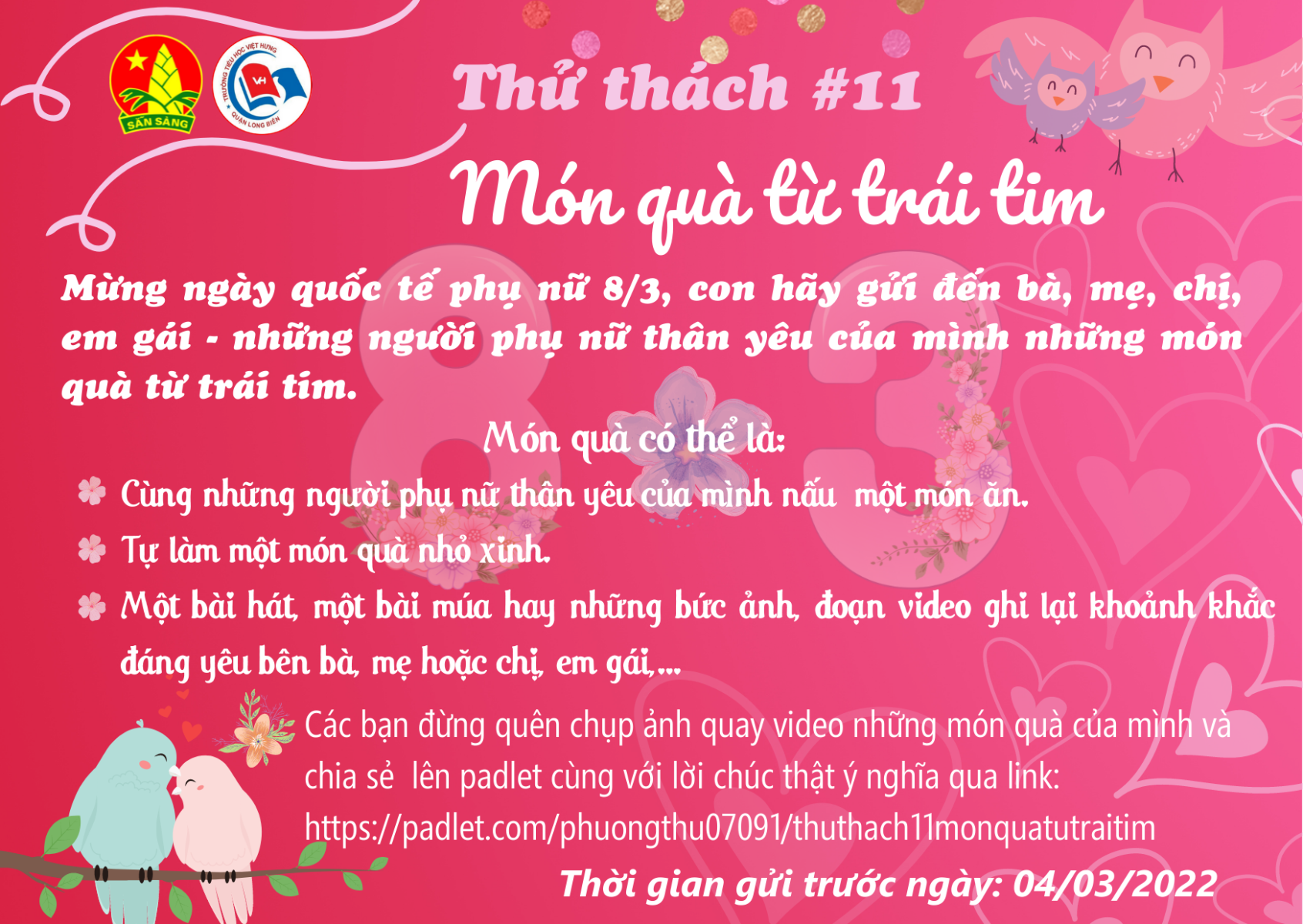 Chào mừng kỉ niệm 112 năm ngày quốc tết phụ nữ (8/3/1910 - 8/3/2022), Liên đội Tiểu học Việt Hưng đã triển khai thử thách 11 mang tên "Món quà từ trái tim". Với thử thách này các bạn thiếu nhi sẽ gửi đến bà, mẹ, chị , em gái - những người phụ nữ thân yêu của mình món quà yêu thương. Món quà có thể là: cùng vào bếp, tự tay làm 1 món quà, hát, múa hay những bức ảnh, video ghi lại những khoảnh khắc đáng yêu bên những người phụ nữ thân yêu của mình.