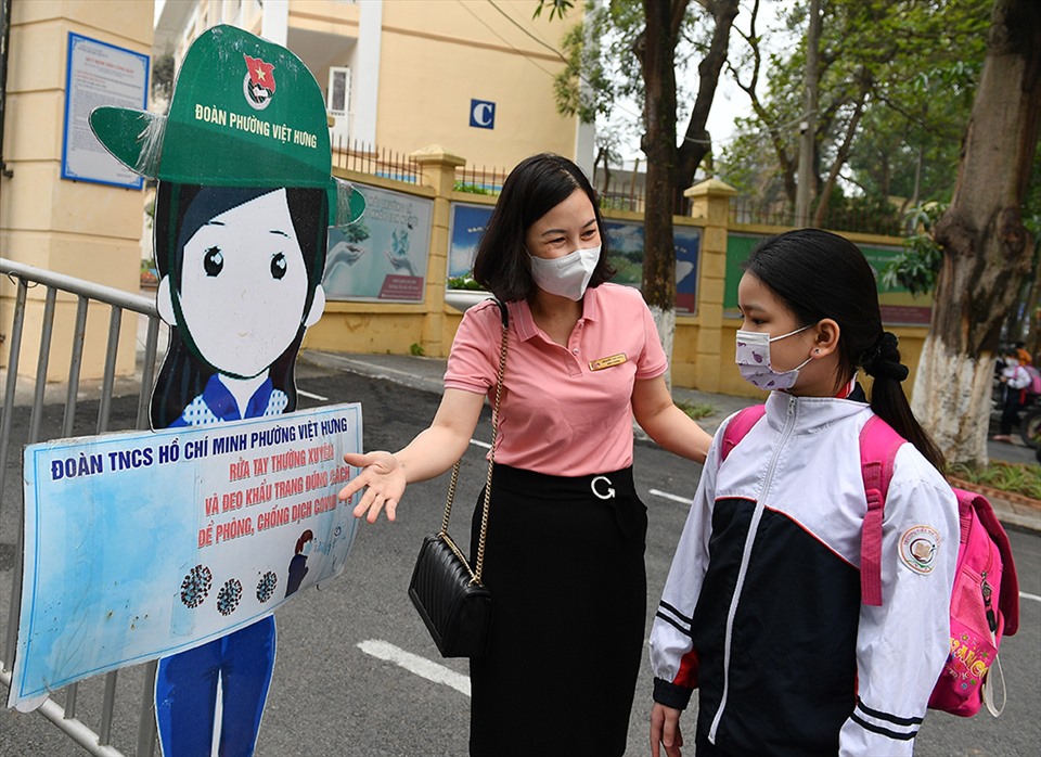 Với các bé từ lớp 2 đến lớp 5 thì đây là buổi gặp lại bạn bè, thầy cô đầu tiên sau thời gian dài phải ở nhà vì dịch bệnh COVID-19. Còn với các bé lớp 1 thì đây là buổi đầu đến trường làm quen với bạn mới, thầy cô mới. Vì thế gương mặt nhiều bé có vẻ hồi hộp trong khi một số phụ huynh lo lắng không biết con mình ngồi ở lớp nào, bàn nào. Nhưng sự lo lắng đó sớm mất đi, khi các cô giáo tận tình ra ngoài cổng trường đưa đón các bé vào trường và dọc hành lang lớp học, các cô giáo khác trong trang phục áo dài đỏ tận tâm dẫn các cháu vào lớp, ở đó tên mỗi cháu được ghi lên giấy gấp đặt trên bàn. Và giờ học mới bắt đầu...