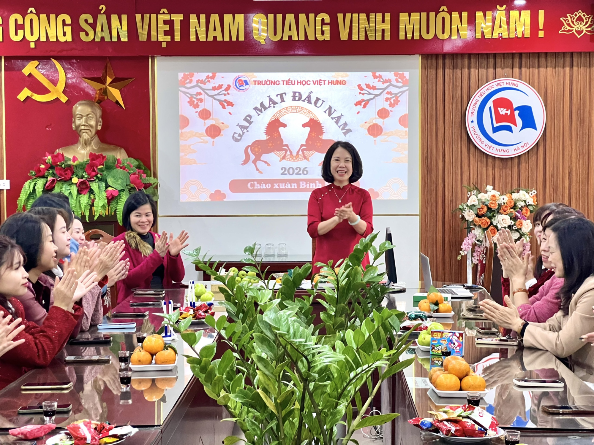 bộ, giáo viên, nhân viên nhà trường hân hoan trong buổi gặp mặt đầu xuân.