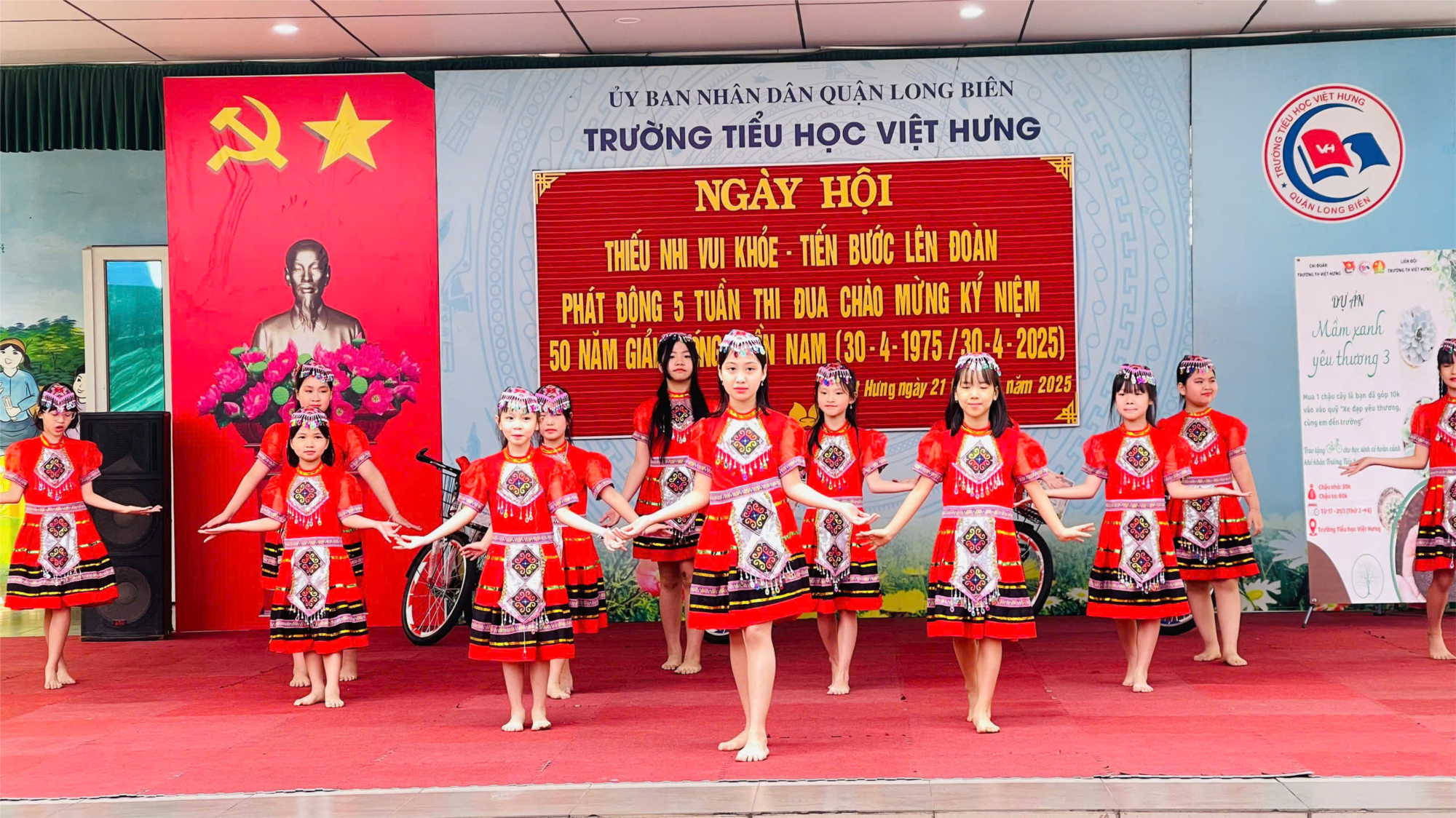Tiếp theo chương trình là màn đồng diễn bài dân vũ của học sinh toàn trường. Đến với ngày hội, các em học