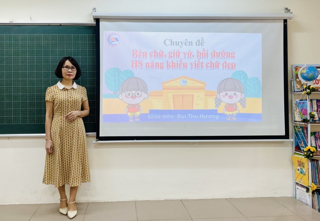 chí Thu Hương đã chia sẻ kĩ thuật viết chữ ghép với chữ cao 5 li và 2,5 li. Đối với học sinh lớp 1, để viết đúng và đẹp chữ ghép, đồng chí Hương