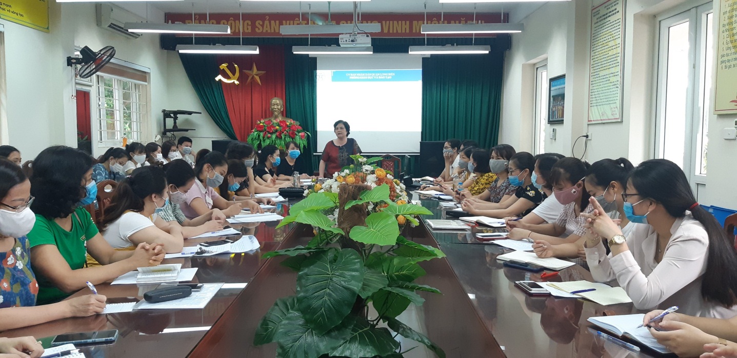 Thay mặt Ban giám hiệu nhà trường, đồng chí Nguyễn Thị Thức - Phó bí thư chi bộ, phó hiệu trưởng nhà trường - đã chỉ đạo, hướng dẫn, yêu cầu cụ thể, chi tiết về quy chế chuyên môn năm học 2020 -2021. Đồng chí đã chỉ rõ những yêu cầu cụ thể của từng loại hồ sơ sổ sách như Kế hoạch bài dạy, lịch báo giảng, sổ dự giờ, sổ tư liệu cá nhân, bảng tổng hợp đánh giá xếp loại học sinh, sổ SHCM của tổ trưởng. Với mỗi loại sổ sách, đồng chí Thức đã chỉ rõ yêu cầu về hình thức trình bày cũng như nội dung. Năm nay, phòng Giáo dục và đào tạo quận Long Biên có hướng dẫn mới về việc sinh hoạt chuyên môn thực hiện Chương trình giáo dục phổ thông cấp Tiểu học. Ngay từ đầu năm học, các tổ chuyên môn nghiên cứu Chương trình giáo dục phổ thông, đề xuất nội dung cần thảo luận trong năm học để xây dựng kế hoạch của tổ. Từ năm học này, các tổ chuyên môn sẽ có những buổi sinh hoạt chuyên môn theo hướng nghiên cứu bài học. Trong buổi học Quy chế chuyên môn, các tổ chuyên môn cũng đã nắm rõ yêu cầu về thực hiện các chuyên đề của năm học này. Ban giám hiệu đã phân lịch dạy chuyên đề cho từng tổ chuyên môn, tránh chồng chéo lịch. Các loại vở của học sinh cũng được quy định rõ ràng trong buổi học Quy chế chuyên môn.