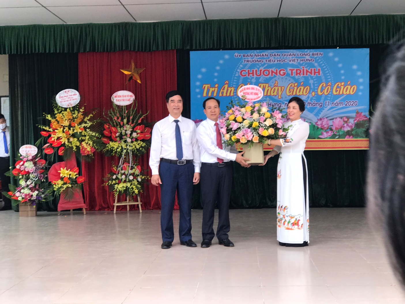 Sau phần nghi lễ chào mừng, cô giáo Đặng Thị Ninh- Hiệu trưởng nhà trường lên đọc diễn văn ôn lại truyền thống ngày 20/11. Tập thể giáo viên của trường Tiểu học Việt Hưng rất vui mừng khi được đón nhận những bó hoa tươi thắm của Ủy ban phường Việt Hưng và của hội CMHS . Em Trương Thùy Dương – Liên đội trưởng, đại diện cho gần 1700 HS trường Tiểu học Việt Hưng lên tặng hoa chúc mừng các cô giáo nhân ngày nhà giáo Việt Nam 20/11.