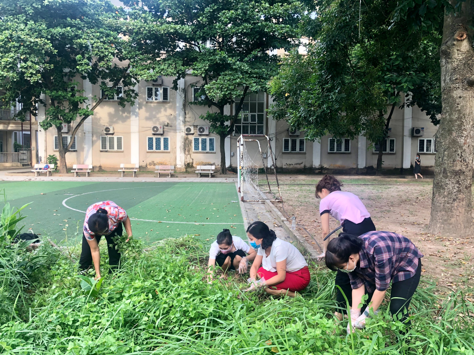 Tổ 5 nhổ cỏ, phát quang bụi rậm vườn sau trường