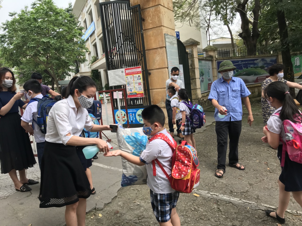 Trong ngày học đầu tiên, học sinh đến trường, nhà trường đã thực hiện triển khai hai vòng đón học sinh để đảm bào an toàn tuyệt đa. Trong đó, vòng một ở ngoài cổng trường, nhân viên bảo vệ và các đồng chí giáo viên được giao nhiệm vụ phân luồng cho các con đi vào trong khu sát khuẩn và được đo thân nhiệt, đặc biệt là việc phụ huynh học sinh sẽ dừng lại ở ngoài mà không được vào sân trường để đảm bảo an toàn. Sau khi qua vòng một, các bạn học sinh sẽ tới vòng 2 ở đầu cầu thang của mỗi dãy nhà. Ở đây các bạn sẽ được đo thân nhiệt và khử khuẩn sát trùng tay với khoảng cách đảm bảo theo yêu cầu. Sau đó, các bạn được nhắc nhở đi thẳng lên trên lớp. Trước khi vào trong phòng học, các bạn luôn được nhắc đeo khẩu trang và tránh tụ tập đám đông.