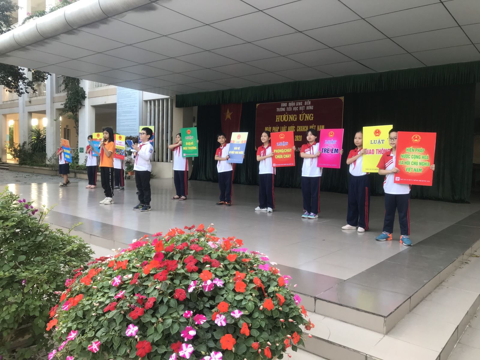 Tiếp theo chương trình, thực hiện công văn số 3442/SGD&ĐT-VP ngày 9/10/2020 của Sở GD&ĐT về việc tổ chức hưởng ứng “Ngày Pháp luật nước CHXH chủ nghĩa Việt Nam” trong ngành GD&ĐT Hà Nội năm 2020, trong buổi lễ chào cờ ý nghĩa này, trường Tiểu học Việt Hưng đã long trọng tổ chức chương trình Hưởng ứng ngày Pháp luật nước CHXHCN Việt Nam. Qua phần tuyên truyền của các bạn học sinh trong đội Tuyên truyền Măng non, các bạn học sinh đã cùng nhau tìm hiểu được lịch sử hình thành, những mốc thời gian sửa đổi,… và những nội dung cơ bản của một số bộ luật cơ bản như Luật Giao thông, Luật Trẻ em, Luật An ninh mạng,…